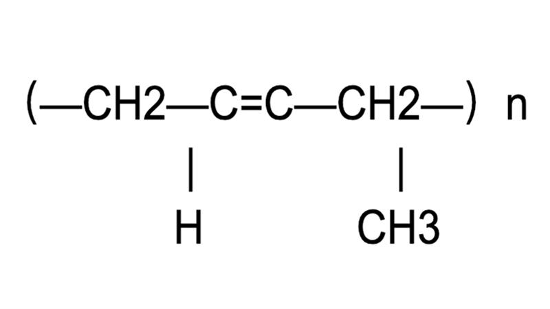 The chemical composition of natural rubber is a polymer of isoprene (C5H8), forming a continuous macromolecular chain: -CH2-C(CH3)=CH-CH2-